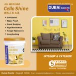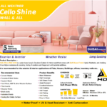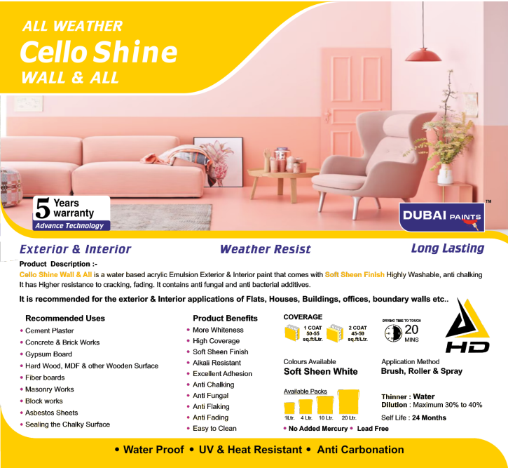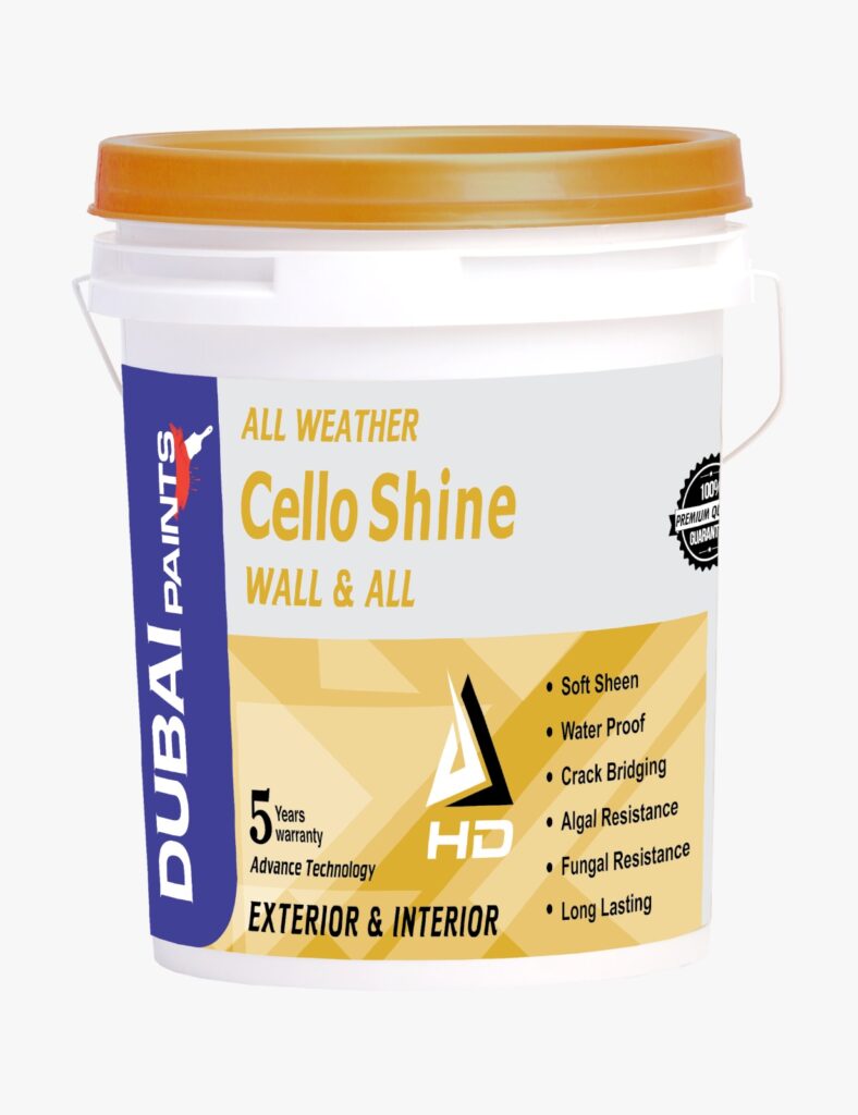 Product Description: Cello Shine Wall & All is a water-based acrylic Emulsion Exterior & Interior paint that comes with a Soft Sheen Finish. It is Highly Washable and anti-chalking. It offers higher resistance to cracking and fading, and contains anti-fungal and anti-bacterial additives.