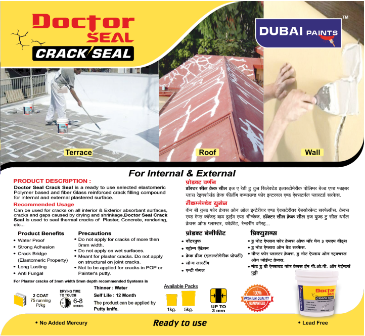 Doctor Seal – Crack Seal (Ready-to-Use Repair Paste) Product Description: Doctor Seal Crack Seal is a ready-to-use selected elastomeric polymer-based and fiber glass reinforced crack filling compound for internal and external plastered surfaces.Product HighlightsApplication Areas: Terrace, Roof, WallStatus: Ready to useQuality: 100% Premium Quality GuaranteedSafety: No Added Mercury & Lead FreeRecommended UsageCan be used for cracks on all interior & exterior absorbent surfaces.Ideal for cracks and gaps caused by drying and shrinkage.Used to seal thermal cracks of Plaster, Concrete, rendering, etc.Capacities: Up to 3 mm crack width.Product BenefitsWater Proof: High resistance to water penetration.Strong Adhesion: Bonds firmly to the substrate.Crack Bridge (Elastomeric Property): Flexible enough to bridge moving cracks.Long Lasting: Durable finish for long-term protection.Anti Fungal: Prevents the growth of mold and fungus.PrecautionsDo not apply for cracks of more than 3mm width.Do not apply on wet surfaces.Meant for plaster cracks. Do not apply on structural or joint cracks.Not to be applied for cracks in POP (Plaster of Paris) or Painter’s putty.Technical SpecificationsRecommended System: For Plaster cracks of 3mm width and 5mm depth.Available Packs: 1kg, 5kgApplication Method: Putty knifeThinner: WaterDrying Time to Touch: 6-8 HOURSSelf Life: 12 Month Quantity Enter an amount ₹ Add to Cart Add to Cart You may also like Previous Next Sale Master Lock – stop leak Sale Silicone tuffen coat – water repellent collections Dubai Paints – DECO-TEX Decorative Texture