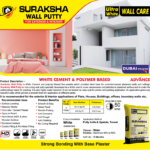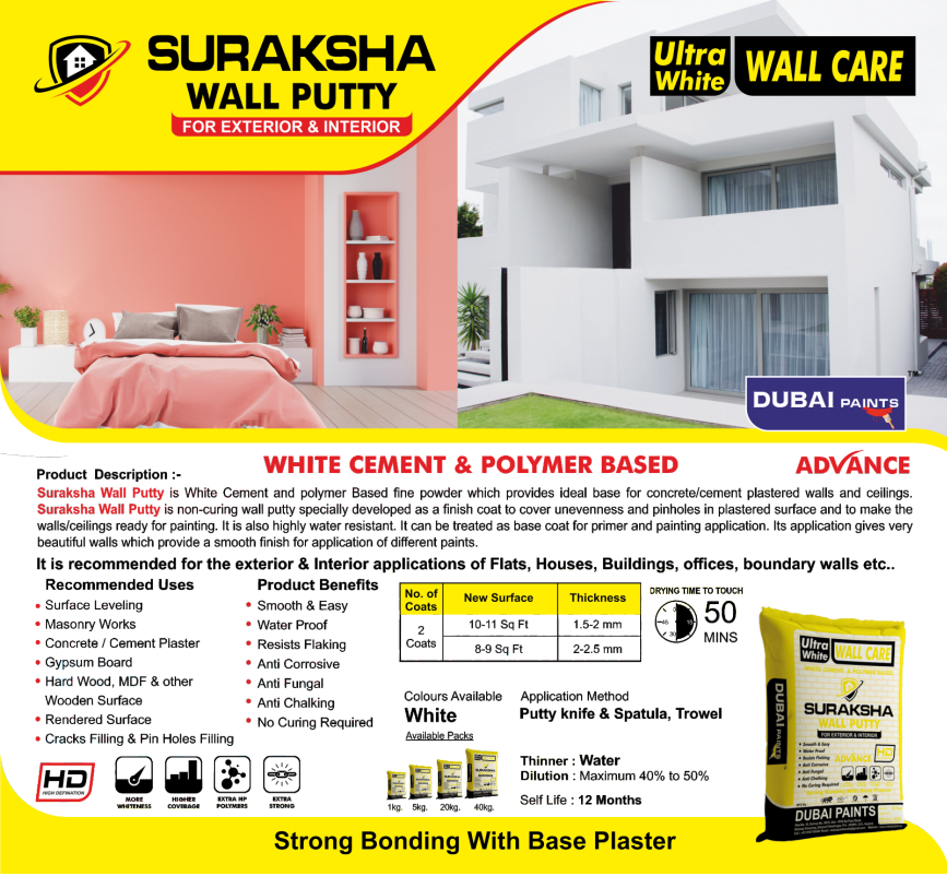 Suraksha Wall Putty is a premium White Cement and polymer-based fine powder that provides an ideal base for concrete/cement plastered walls and ceilings. It is a non-curing wall putty specially developed as a finish coat to cover unevenness and pinholes in plastered surfaces, making walls and ceilings ready for painting.